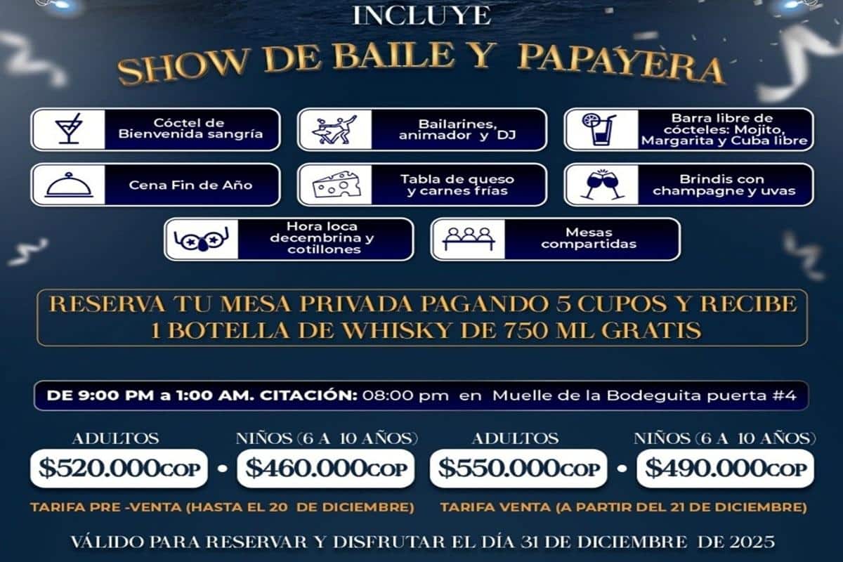 The 31 de diciembre no es solo una fecha en el calendario. Es el momento más esperado del año, donde despedimos los 365 días vividos y damos la bienvenida a nuevas oportunidades, sueños y esperanzas. Y no hay mejor forma de hacerlo que celebrando la Cena San Silvestre en la embarcación Bequia, una experiencia mágica de 4 horas de navegación por la bahía de Cartagena, con música, cena gourmet, espectáculo en vivo y la mejor energía del Caribe.